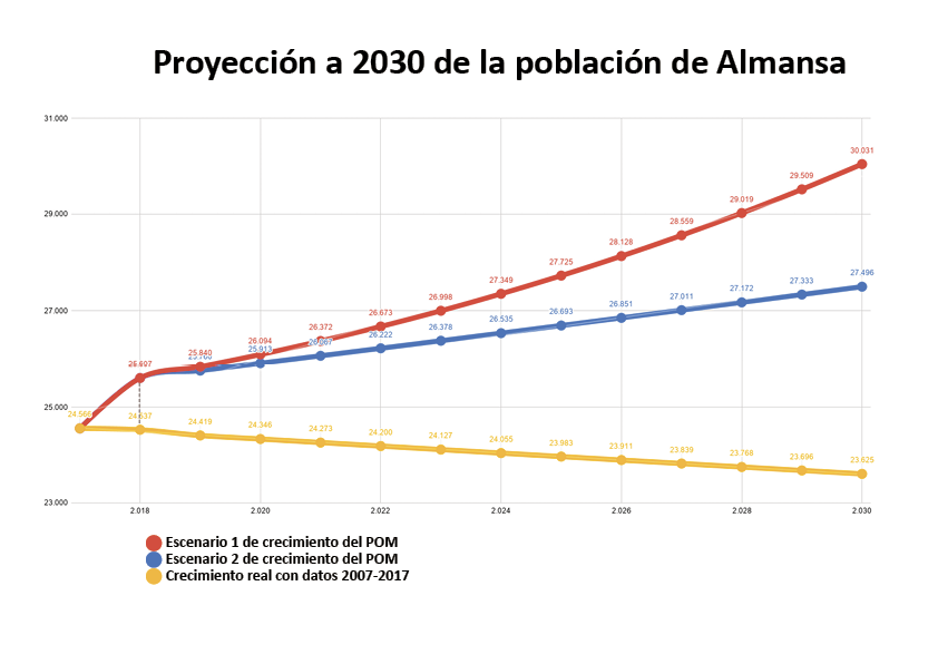 En la nueva edición del POM utilizan -para predecir el crecimiento futuro de la ciudad- el movimiento de la población entre los años 2001 y 2011 (once años durante los que Almansa creció en 1.448 habitantes); en lugar de basarse en los últimos datos que tenían disponibles en el cierre de este documento, esto es el periodo 2007-2017. Unos once años cuyos datos arrojan una pérdida de población de 706 habitantes en Almansa y hubiera reflejado una tendencia decreciente de la ciudad.